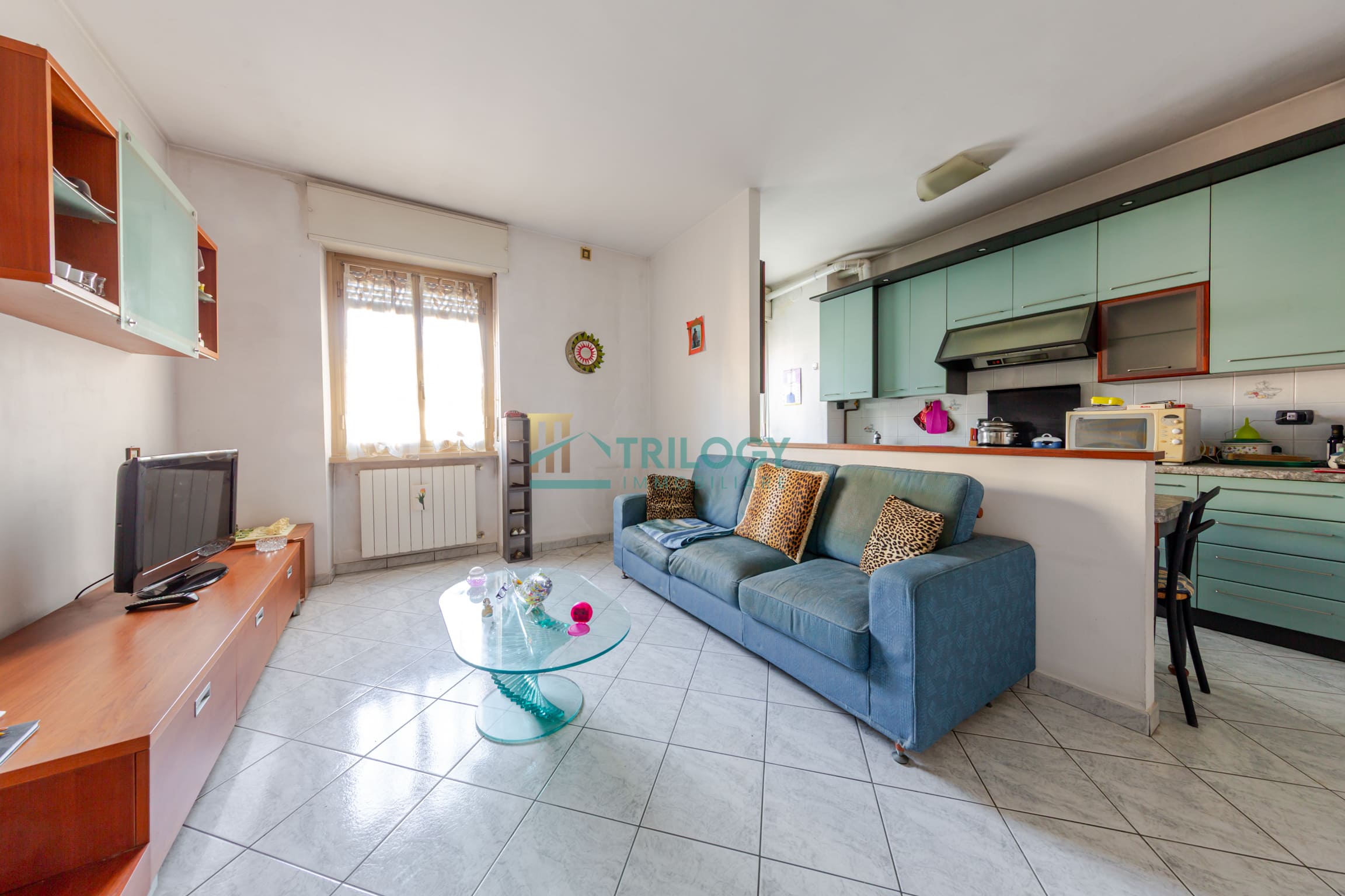 ingresso su ampio soggiorno con cucina lineare a vista, bagno finestrato, ripostiglio e camera matrimoniale con accesso al balcone.