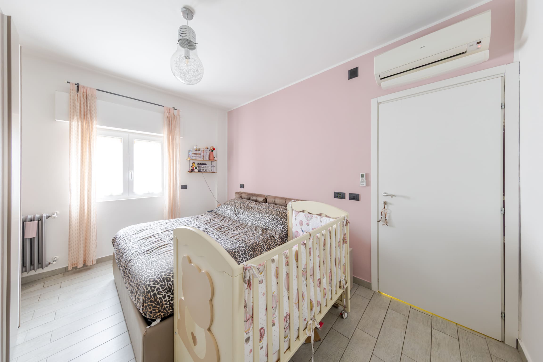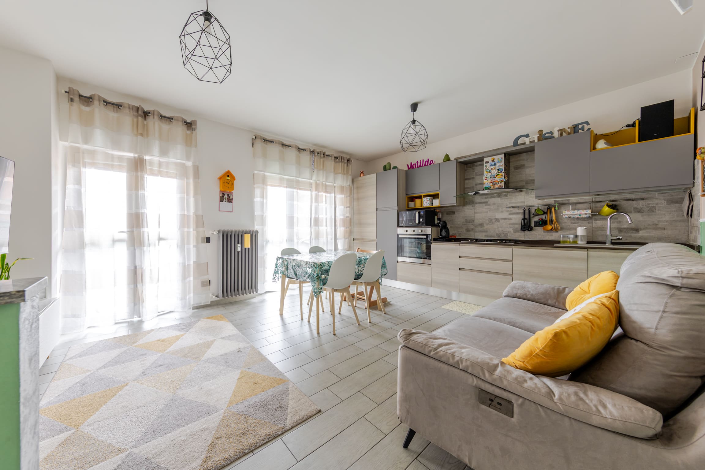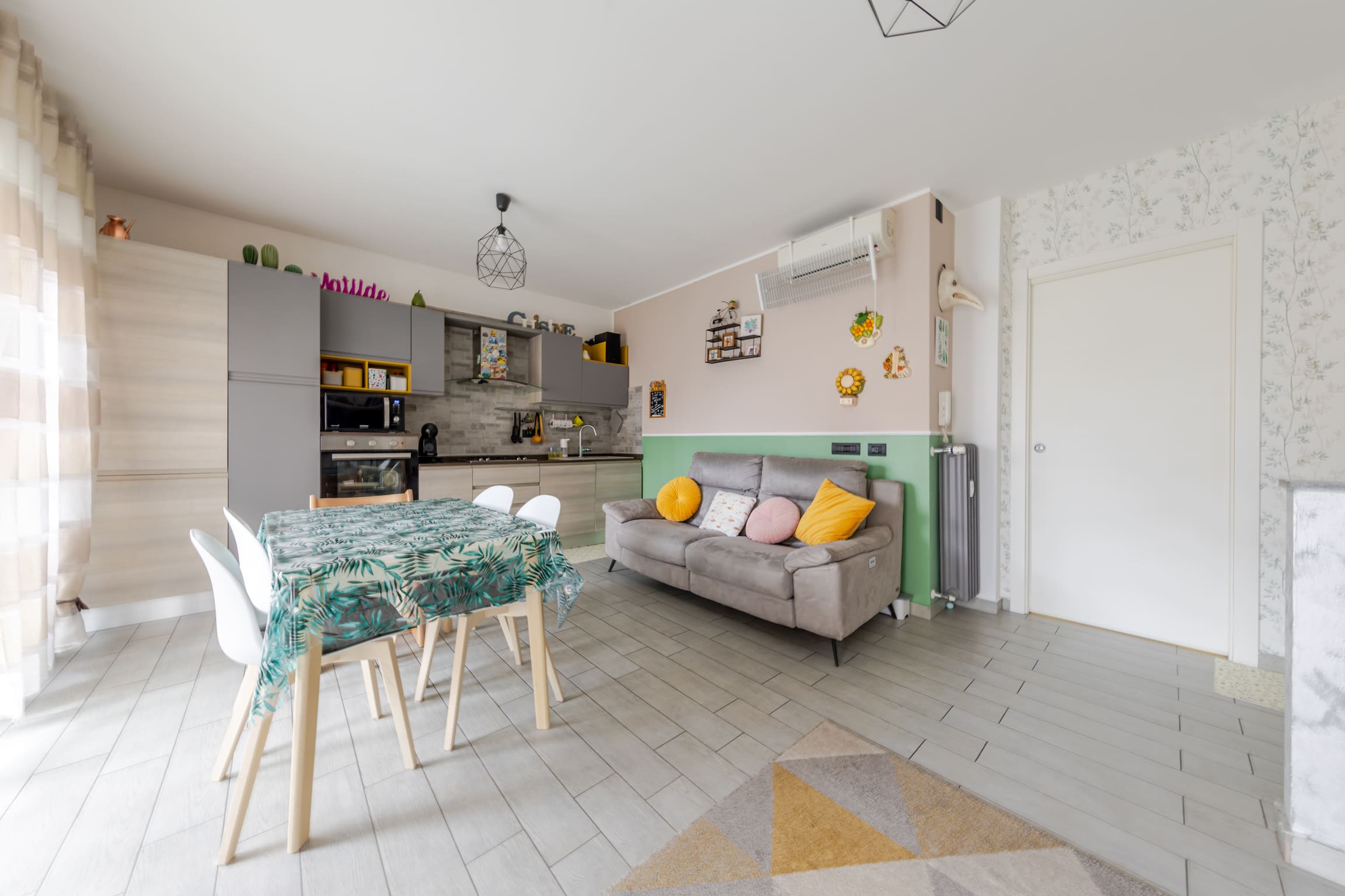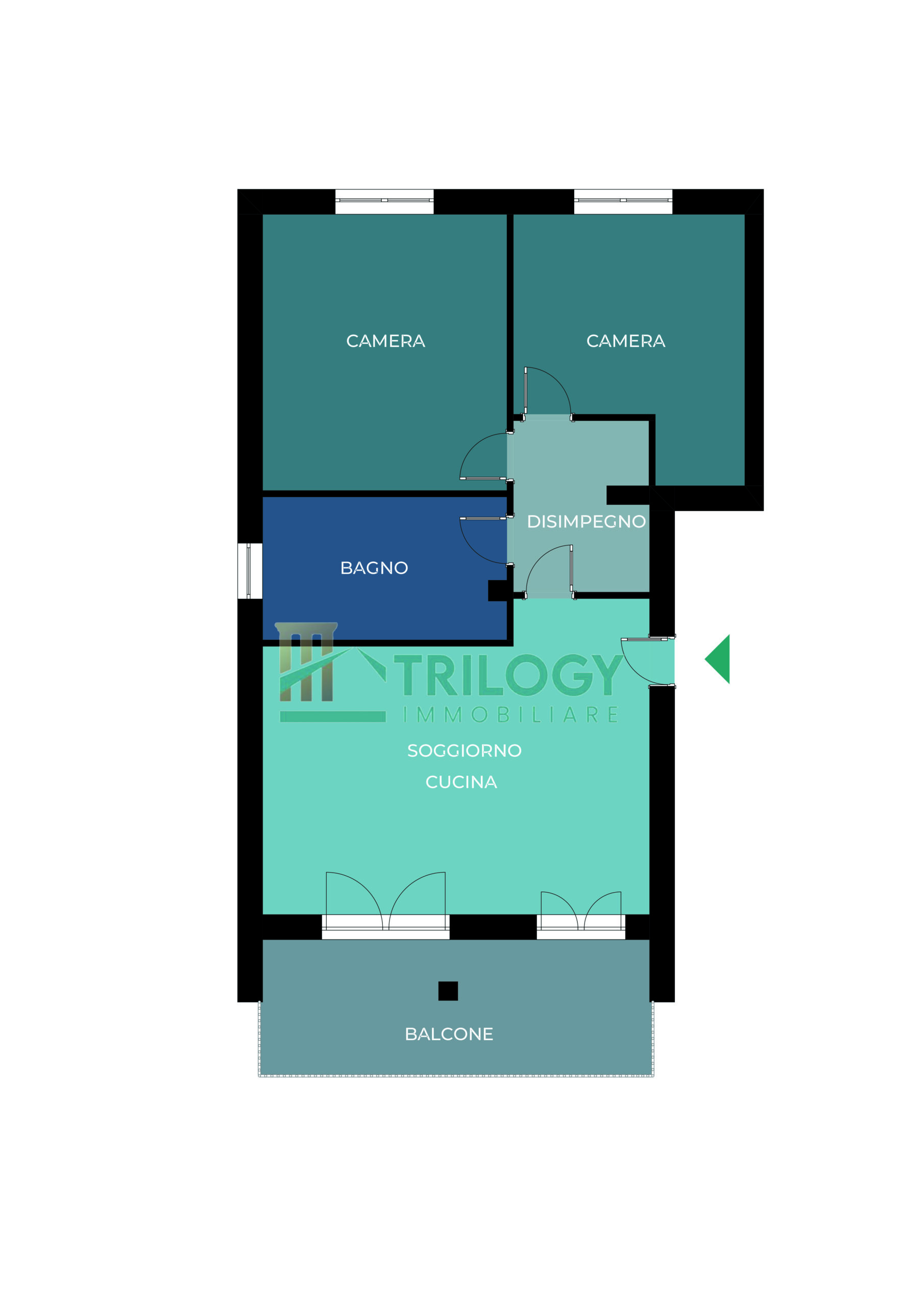 ingresso su luminoso soggiorno con cucina open space e doppio accesso al terrazzo, disimpegno, bagno finestrato, cameretta, camera matrimoniale e comoda zona lavanderia.